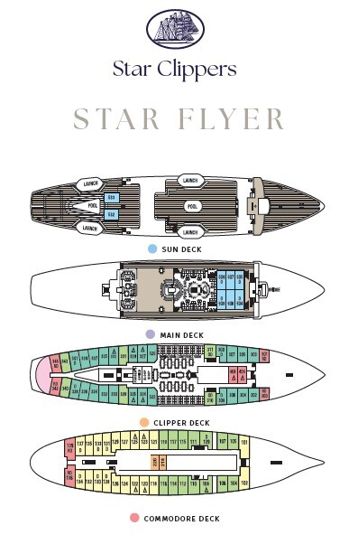 Pricing based on double occupancy. No cabins can be held; cabin assignments are made with full passenger names and deposits of $800 per person for Owner’s Suite, Deluxe, and Category 1, or $400 per person for Categories 2–6. Offer may be changed or withdrawn at any time. Other restrictions may apply. © Star Clippers 2026. Ship’s Registry: Malta. ST#37231.