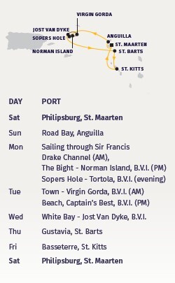 From the colorful streets of St. Maarten to the pristine beaches of Anguilla, Virgin Gorda, Jost Van Dyke, St. Barts, and St. Kitts, each day reveals a new island treasure. Glide through the scenic Sir Francis Drake Channel, drop anchor at iconic ports, and discover hidden coves only accessible by small sailing vessels.